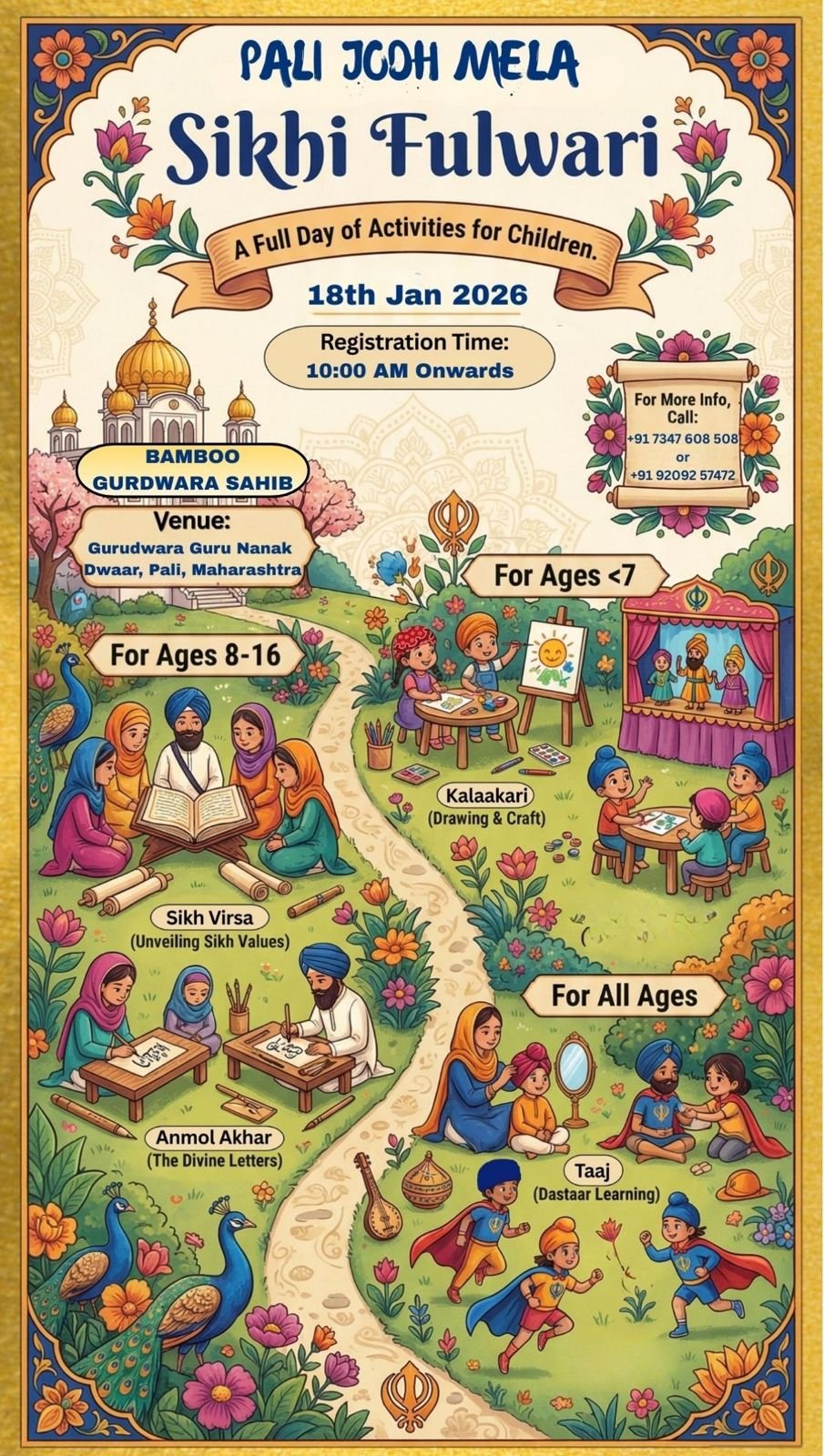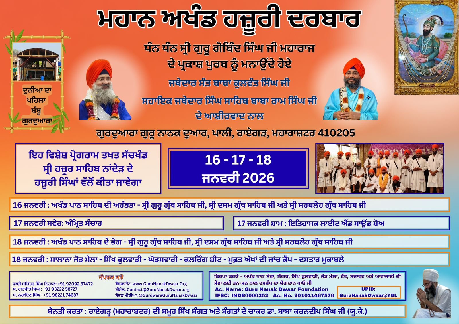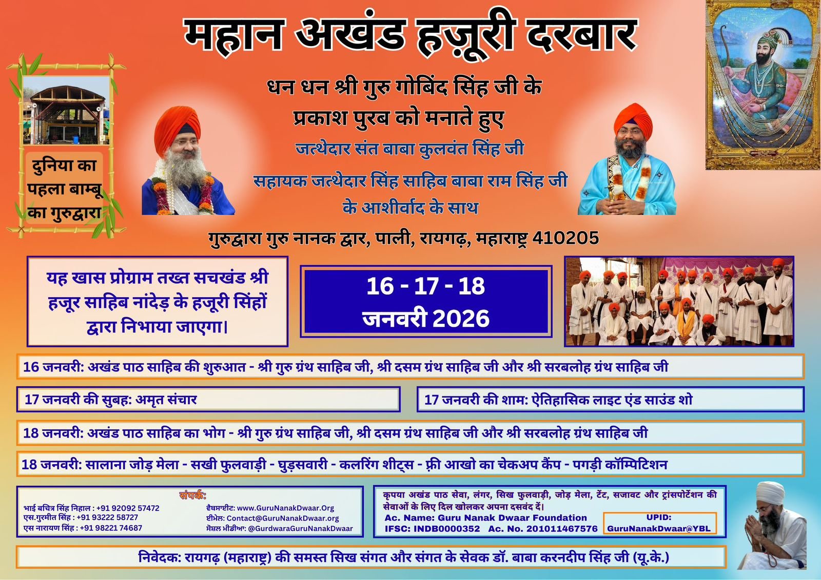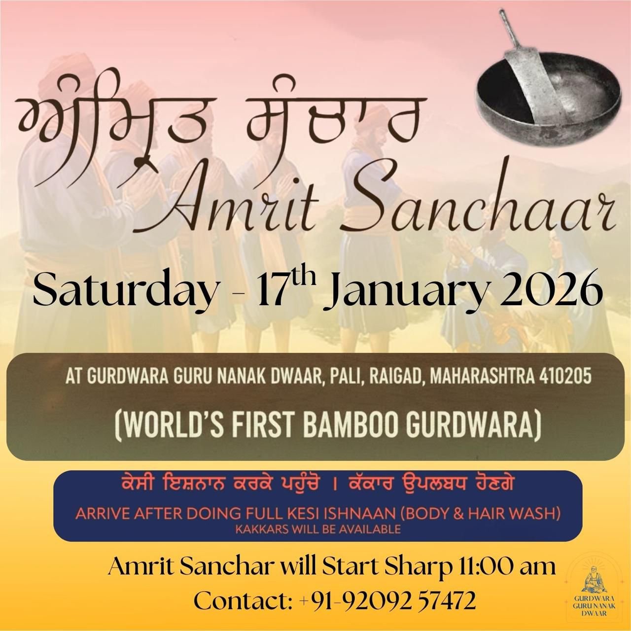 of Pali, puratan maryada, Akhand Gurbani Jaap🙏 (Sri Guru Granth Sahib Jee, Sri Dasam Guru Granth Sahib Jee, Sri Sarabloh Granth Sahib Jee, Amrit Sanchar, ✨Free Eye check-up Camp, Horse riding, Turban Tying sessions, loads of Langar🫕 items, new friends, new family🧡, and a lot more at 🪯World’s First Bamboo Gurdwara Sahib🪯, Pali, Raigad during Annual Akhand Hazuri Darbar – 2025. 💫